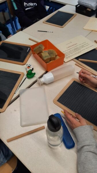 Onder leiding van juf Riky en juf Hilly was op de klomp schrijven, liekelattien met lei en griffel en in Mooi Plat diverse dialect woorden opzoeken. Met het aangeboden dialect kwartetspel werd er onder leiding van juf Hilly fanatiek kwartet gespeeld met de nodige hilariteit.