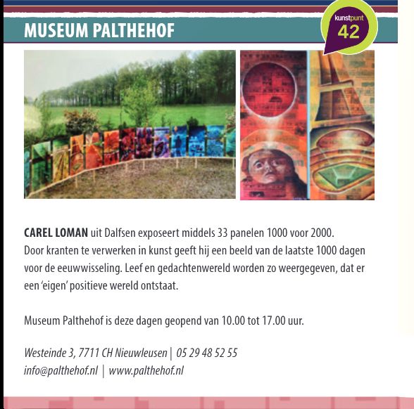 Carel Loman uit Dalfsen exposeert middels 33 panelen 1000 voor 2000 in de kapschuur op het terrein van Museum Palthehof. Door kranten te verwerken in kunst geeft hij een beeld van de laatste 1000 dagen voor de eeuwwisseling. Leef- en gedachtewereld worden zo weergegeven, dat er een ‘eigen’ positieve wereld ontstaat.